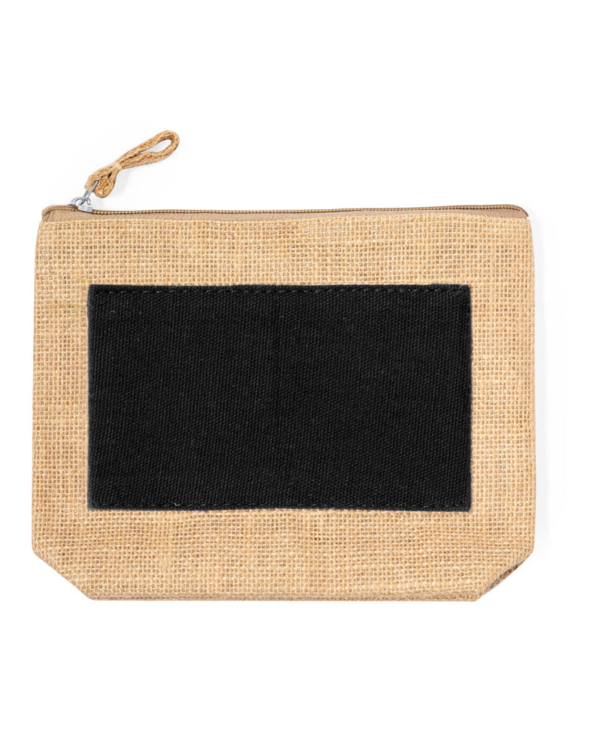 Multipurpose toiletry bag in a combination of laminated jute and natural cotton. With a zipper closure and matching jute puller. Cotton center in a variety of colors.