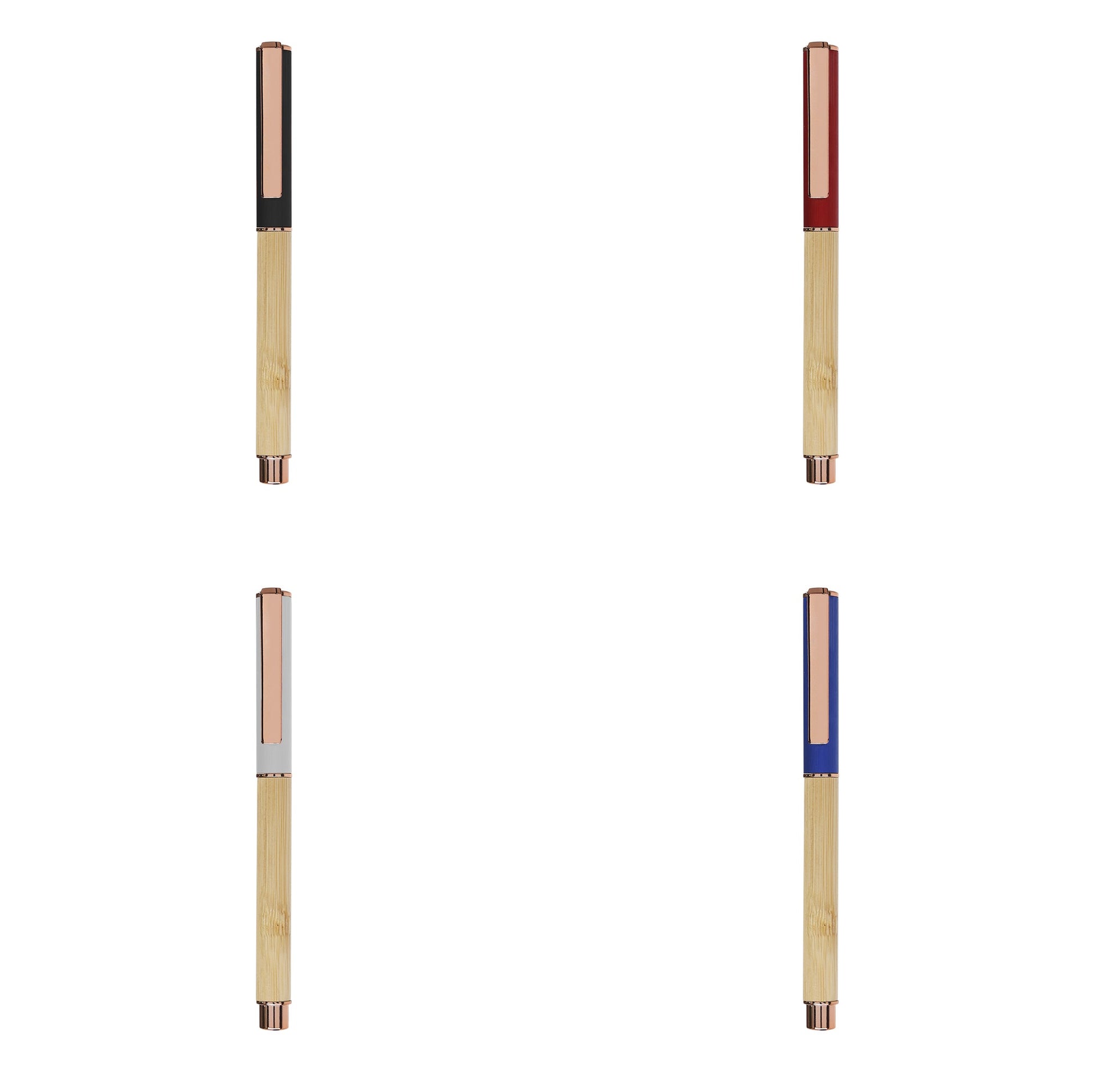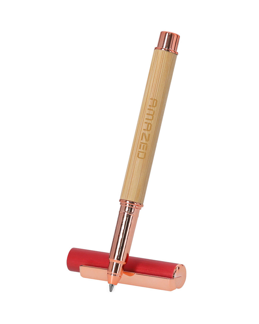 Elegante roller fabricado en bambú y aluminio. Con clip metálico, empuñadora y detalles de acabado oro rosa, caña fabricada en bambú y tapadera en aluminio. Con cartucho jumbo, en tinta azul y con cierre de capucha.